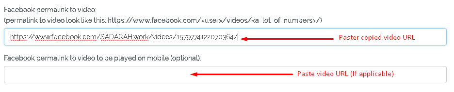 4. Go back to Explaindio Player and paste the copied Video URL under Facebook permalink to Video. If you want to play a different video on mobile devices copy and paste the video URL for mobile devices under Facebook permalink to video to be played on mobile (optional) following same steps.